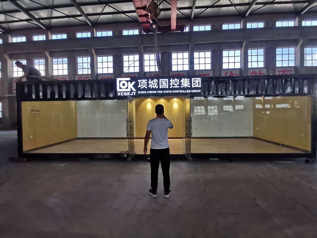 河南項城國控集團銷售中心,定制尺寸為3620*10200*2700mm,總面積37m2,近乎相當于1.5個40GP貨柜箱。外墻為1.2mm厚金屬波紋板,彰顯集裝箱霸氣外形。內(nèi)墻為吸音板+硅酸鈣板,前墻落地玻璃窗,窗明幾凈。本產(chǎn)品采用工廠化加工,整體運輸,不僅省去了現(xiàn)場施工環(huán)節(jié),而且方便運輸,可循環(huán)使用,大大節(jié)約了造價成本。